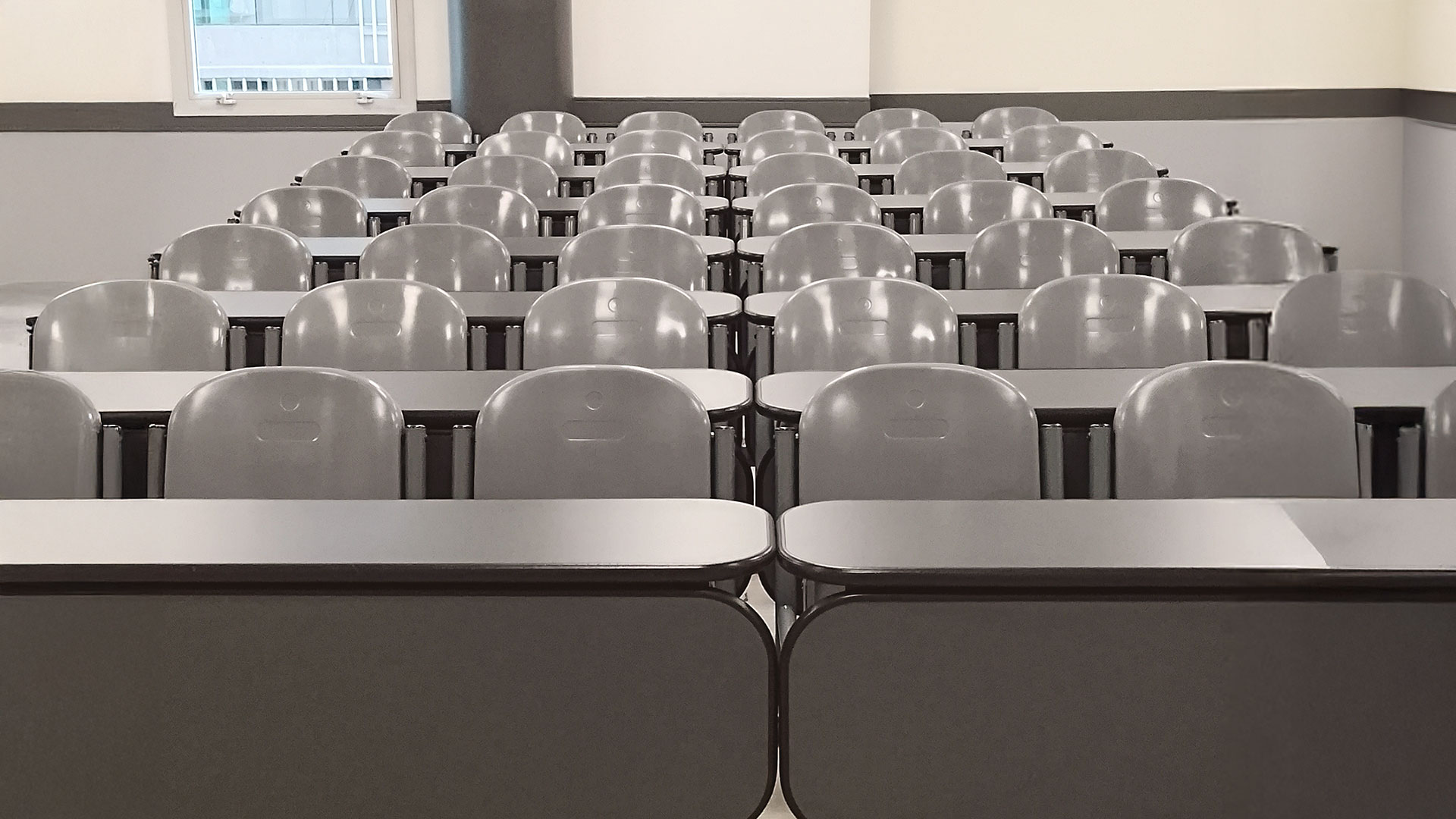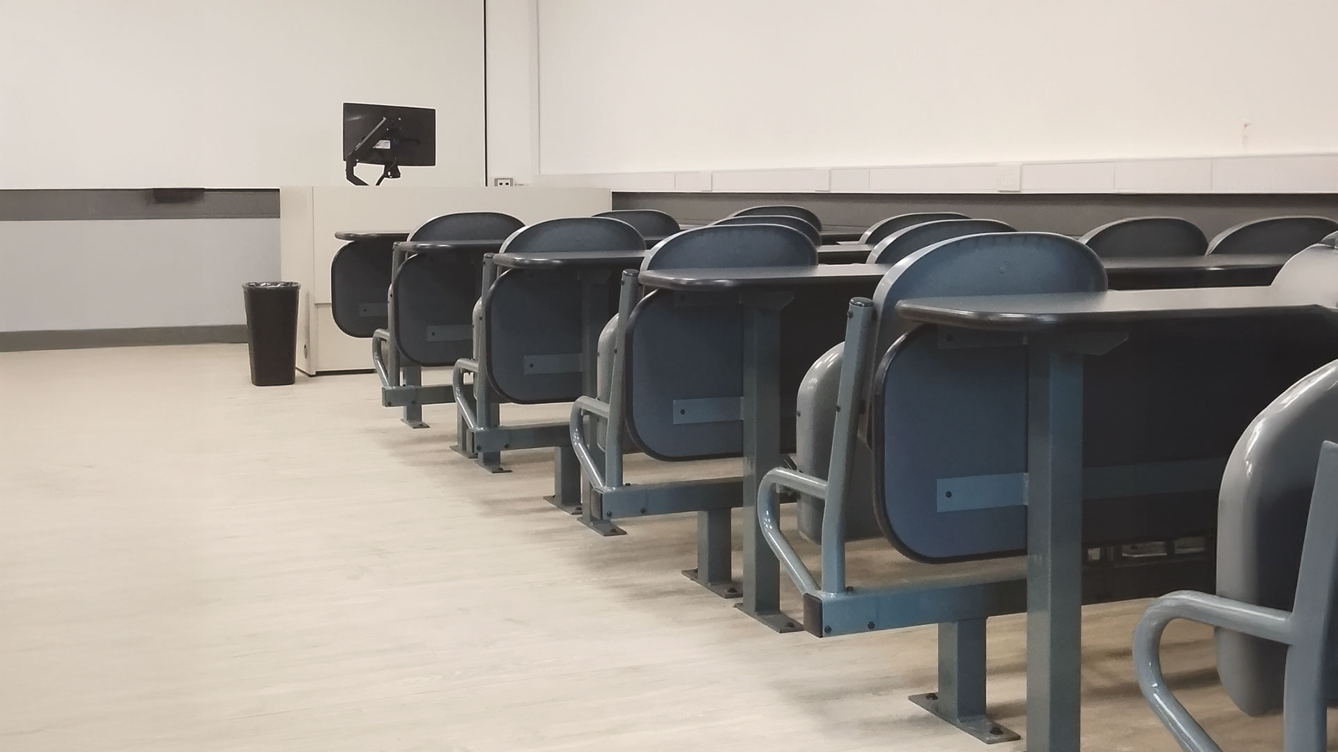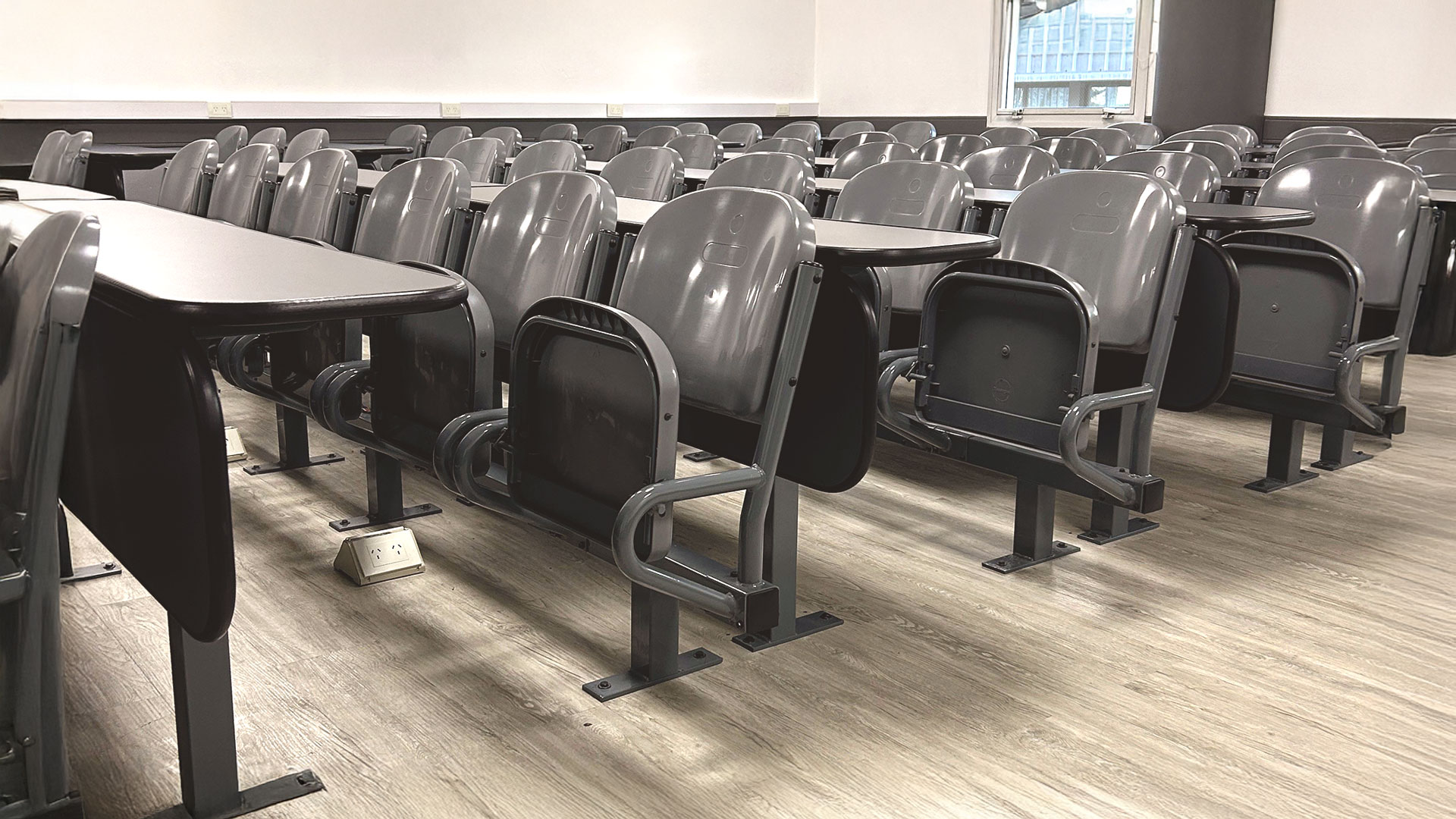 En las aulas 201/301/401 se instalaron 75 asientos modelo Spectra Pupitre por aula, diseñados para cubrir necesidades de usos extremadamente intensivos y fácil mantenimiento. Se seleccionó asientos color gris con pupitres de tapa color gris con canto de PVC negro.