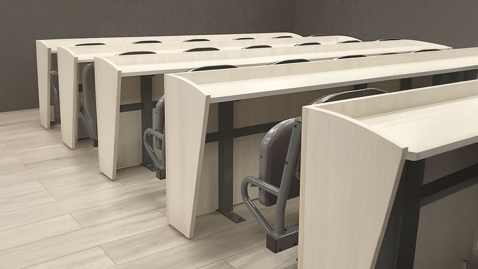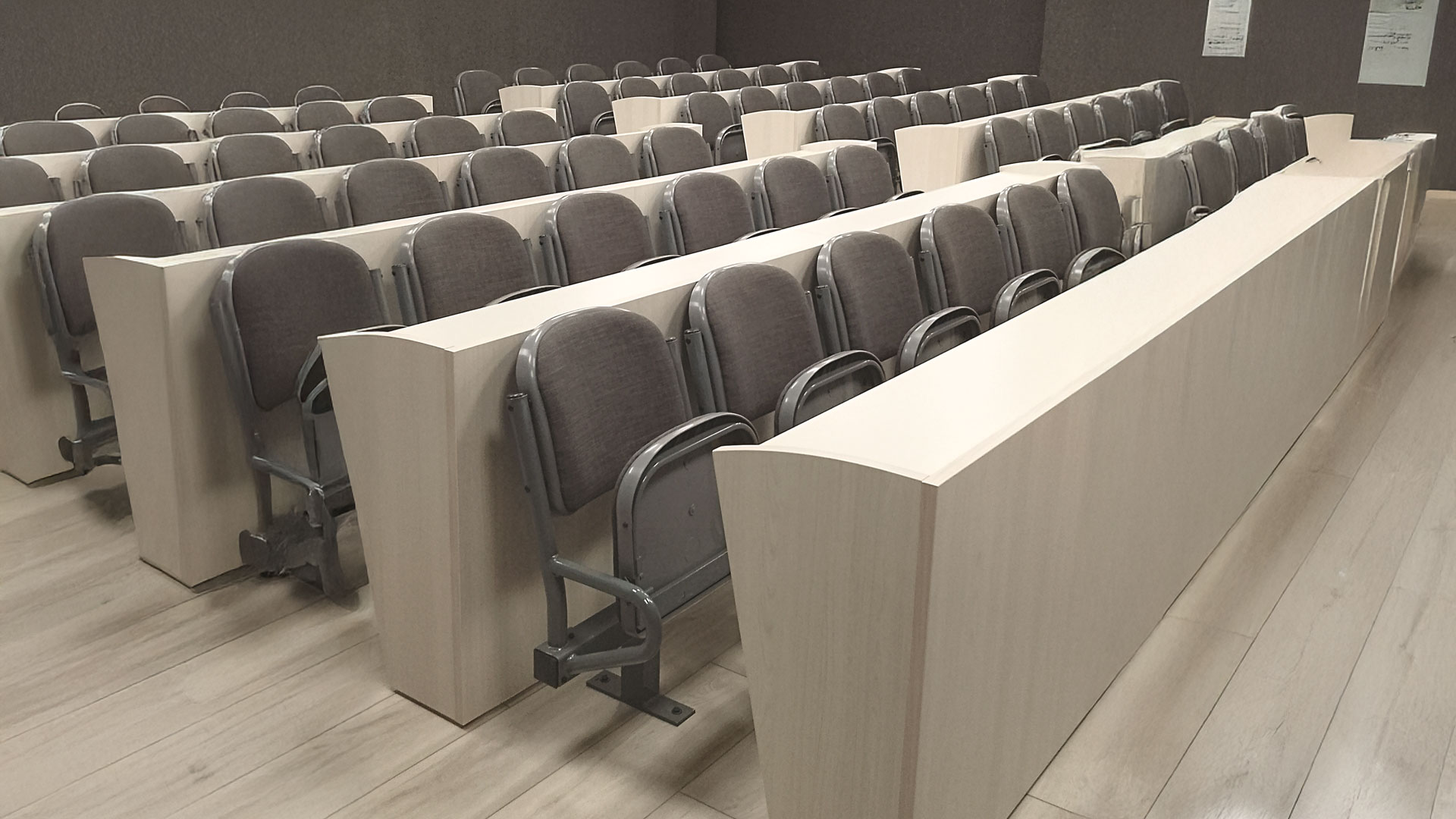 En las aulas 310/410 se instalaron 69 asientos modelo de Spectra Pupitre Senior por aula. Este modelo cuenta con almohadillas de tapizado en asiento y respaldo, elevando el nivel de confort y jerarquía del aula. Los pupitres se seleccionó melamina Teka Ártico con tapa gris ceniza. Además en otras aulas se combinaron soluciones de sillas T4 según requerimientos de uso y funcionalidad de la sala.